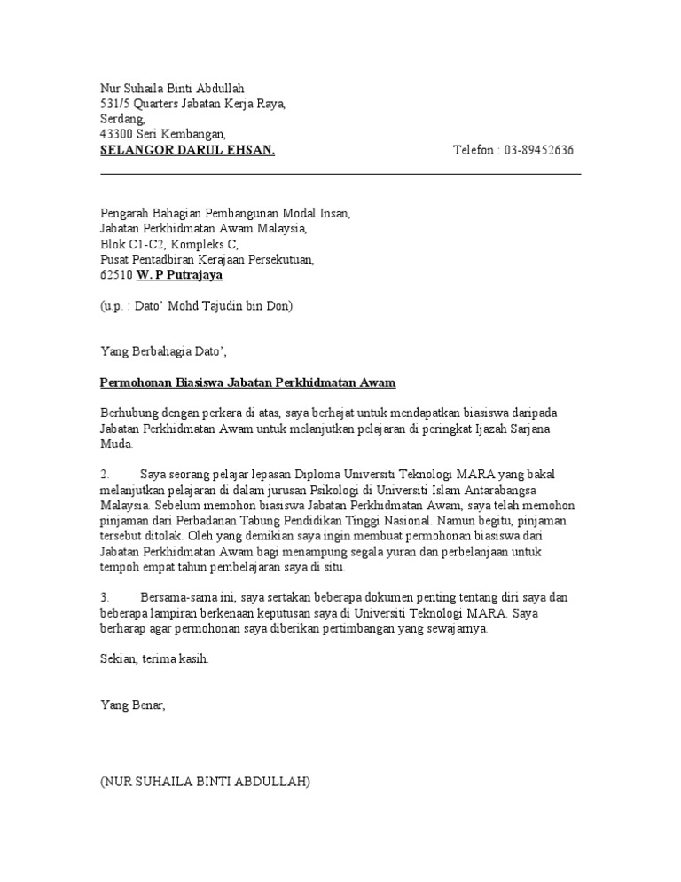 Contoh Surat Permohonan Biasiswa Jpa Mara