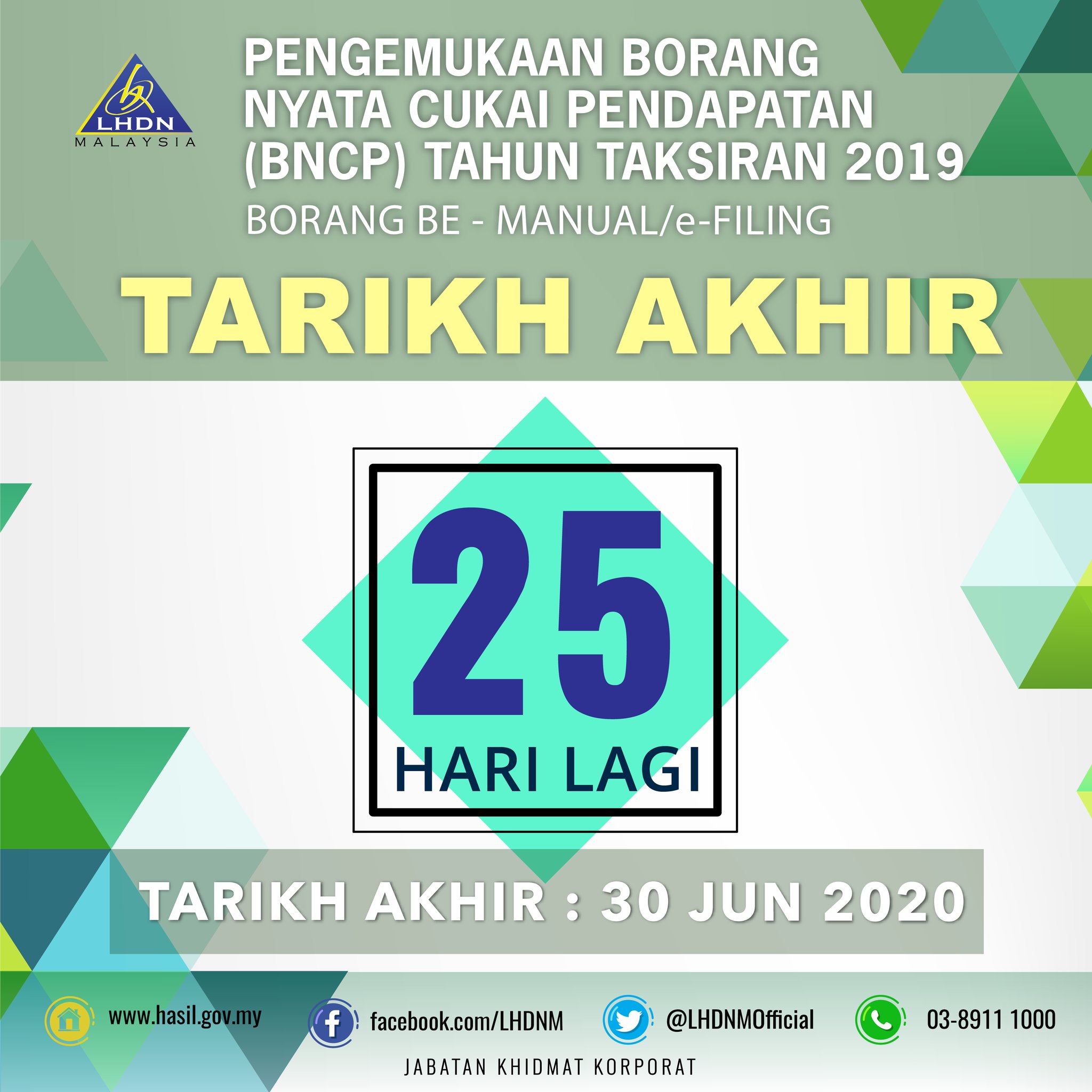 Tarikh akhir pengemukaan borang be tahun taksiran 2018 adalah 30 april 2019. Lembaga hasil dalam negeri lhdn melalui lampiran yang boleh dirujuk di lhdn yang memaklumkan bahawa pembayar cukai boleh mengemukakan borang nyata cukai pendapatan bncp tahun taksiran 2019 mereka melalui e filing bagi. Bilakah tarikh akhir hantar borang cukai pendapatan untuk taksiran tahun 2019. Tambahan masa diberikan sehingga 30 jun 2020 bagi pengemukaan secara e filing pos atau serahan tangan.